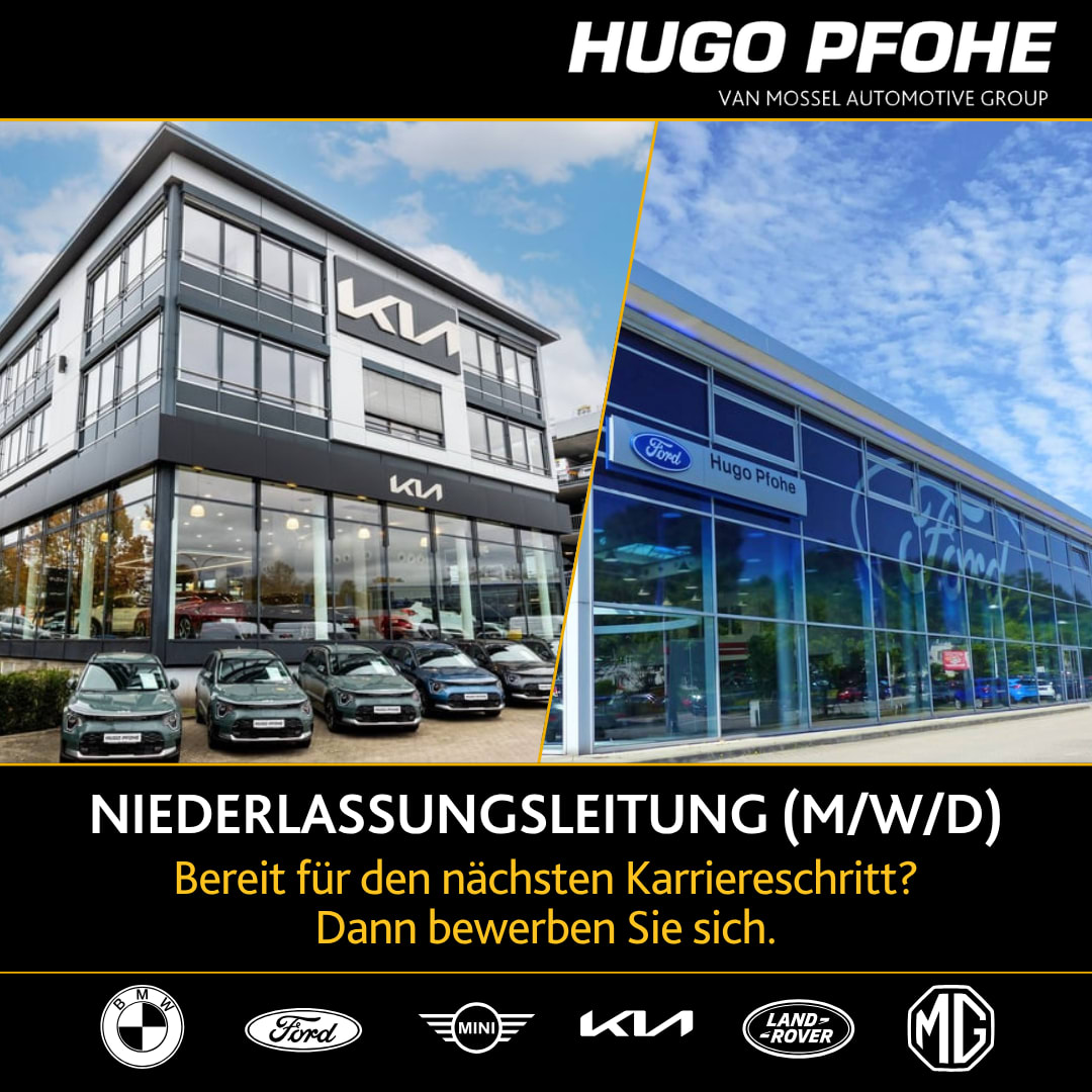 Die Hugo Pfohe GmbH ist Teil der international erfolgreichen Van Mossel Group, einer der führenden Automobilhandelsgruppen in Europa. Am größten Standort in Hamburg vertreten Sie starke Marken wie Ford, Kia und Land Rover im Neu- und Gebrauchtwagengeschäft, führen über 200 Mitarbeitende, steuern Vertrieb und Service und berichten direkt an die Geschäftsführung.